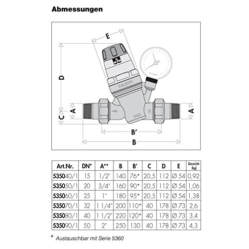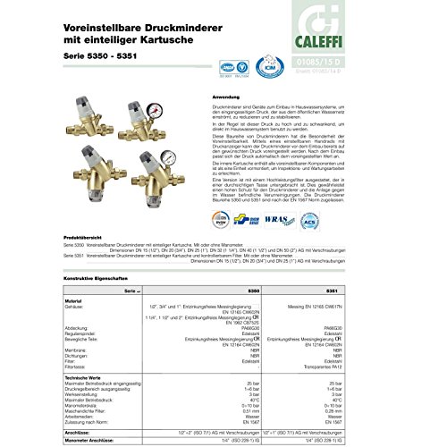 Specification: Caleffi Wasserdruckminderer 1/2 Zoll DN15 Druckminderer für Wasser mit Austauschbarer Kartusche und Manometer, Druckminderungsventil, Druckregler 535041, mehrfarbig